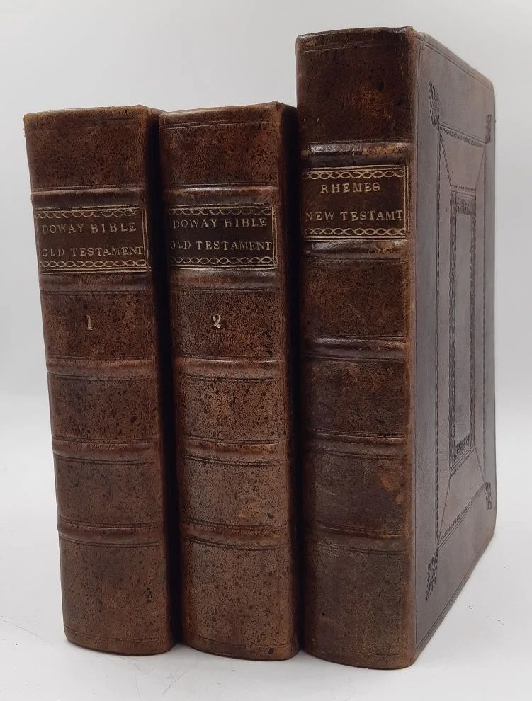 The first item that caught my eye was a first edition Douay-Rheims Bible offered by Voewood Books. The three foxed but otherwise unassuming volumes had been featured in the 2025 catalogue under the headline “Catholics in Exile,” which explained that this edition’s Old Testament and New Testament were translated 30 years apart from each other because it “preceded of one general cause, our poore estate in banishment”—a reference to Elizabethan-era anti-Catholic laws. Its contents being essentially criminal at the time made for an intriguing enough story, but this particular copy also had a unique Jesuit provenance.